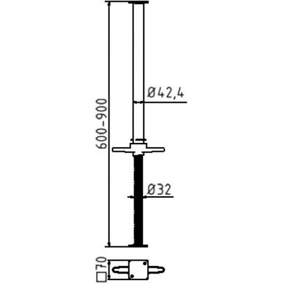 ploščami 70 mm x 70 mm na obeh straneh, vreteno in cev sta trdno povezana z
